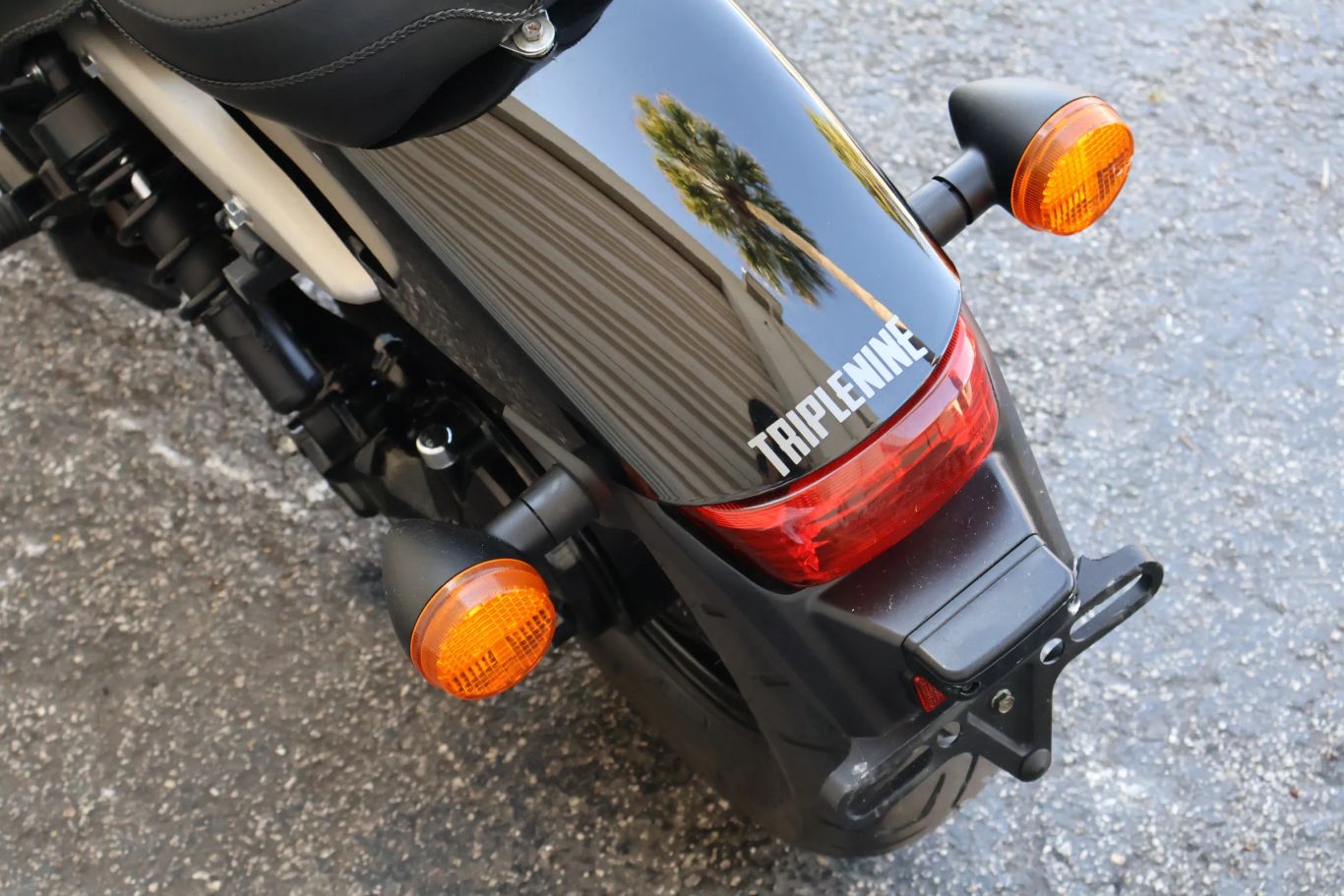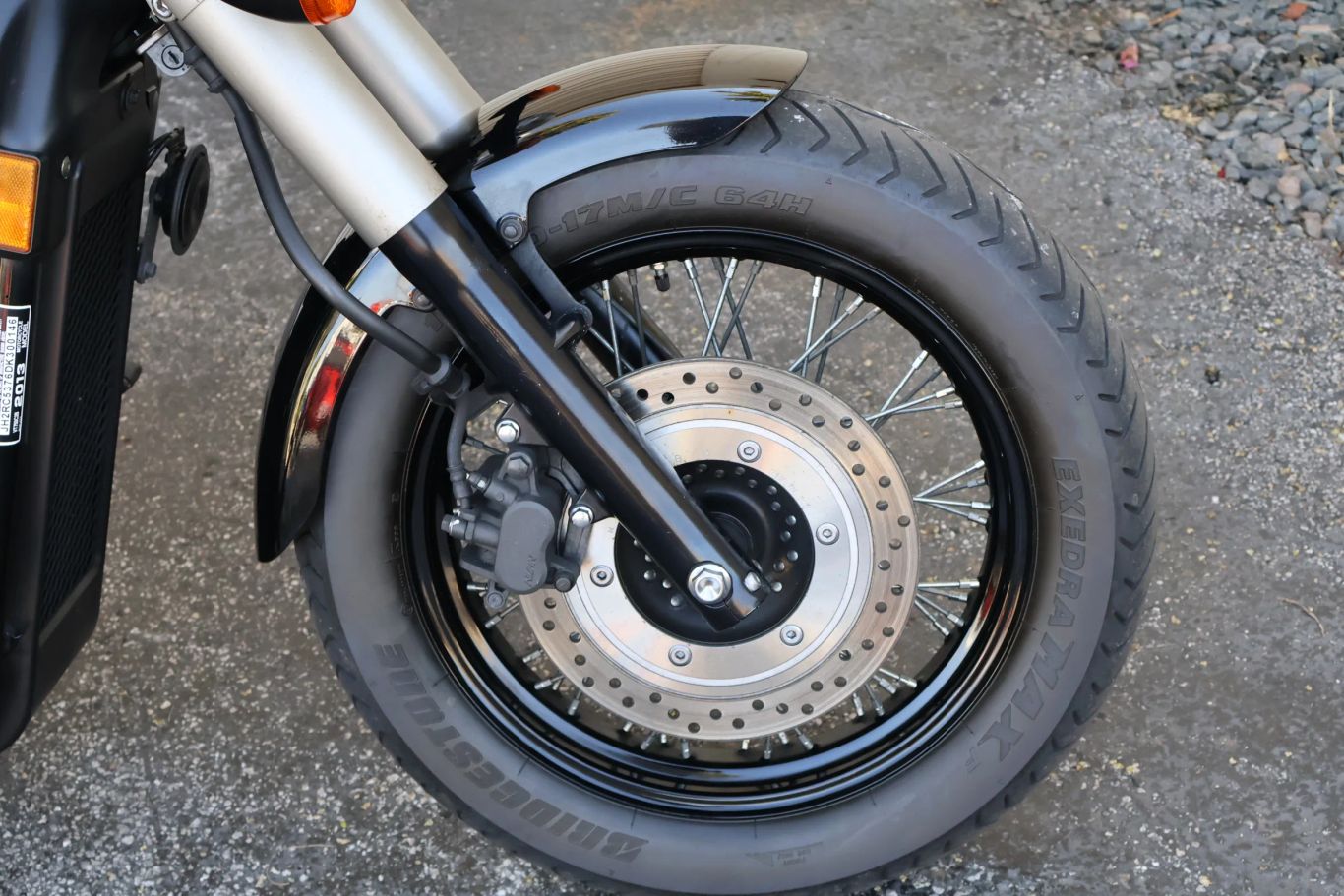 - Style: Matte black/black-out finishes, bobber-style minimalist front fender, black spoked wheels and black engine covers