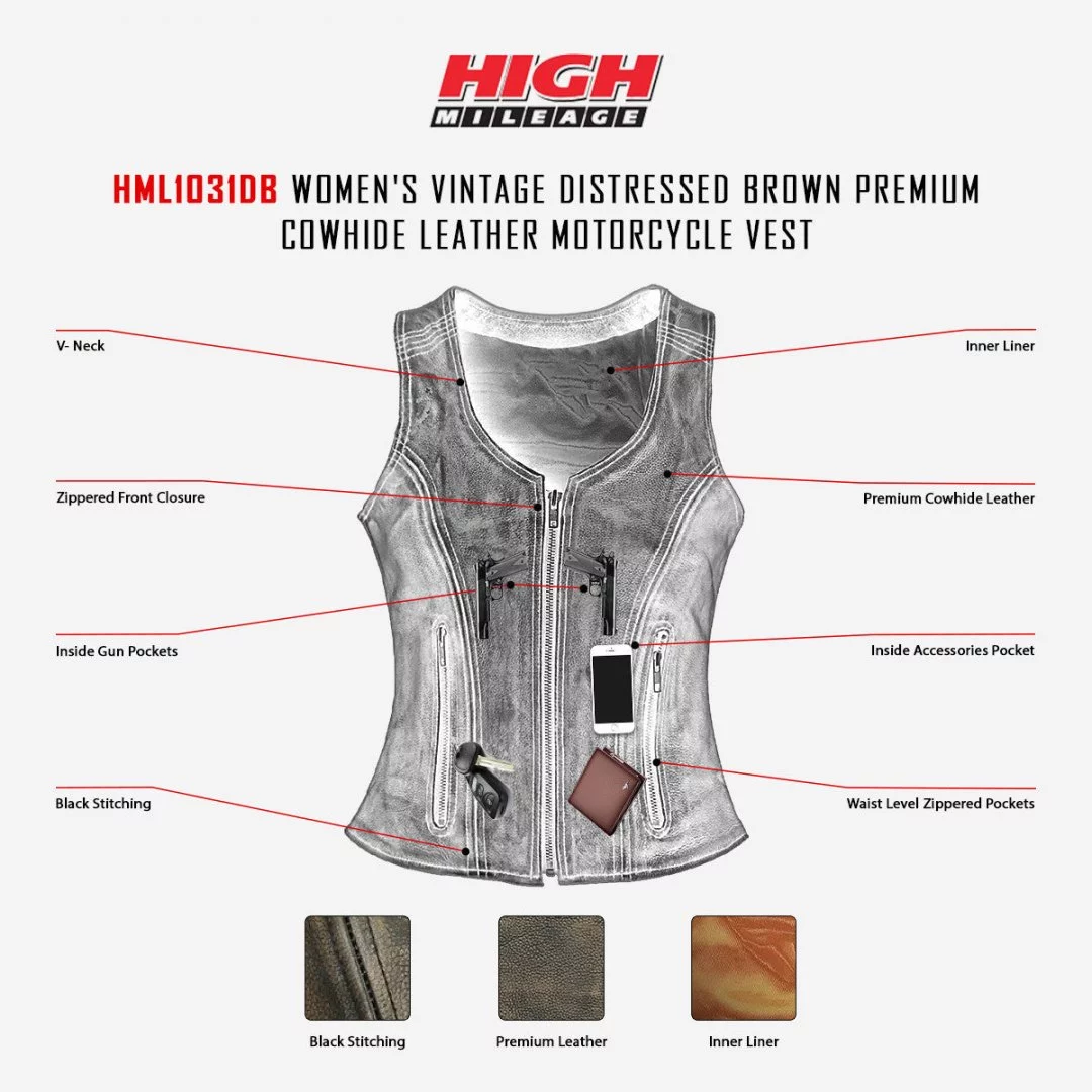 High Mileage HML1031DB Womens Vintage Distressed Brown Premium Cowhide Leather Motorcycle Vest