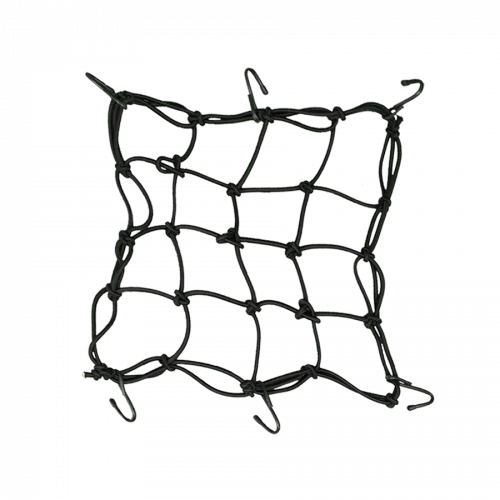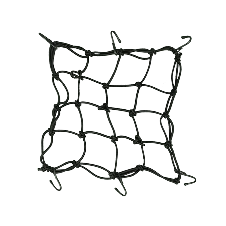 Heavy-duty bungee-cord net for securing gear on motorcycle, ATV, snowmobile or bike. Interwoven cross-cords prevent slipping or gaps; 3″ x 3″ grid pattern, black. Bungee-cord net for securing gear on motorcycle, ATV, snowmobile or bike Net & hooks roll into ball about size of baseball for easy stowing Six 2-1/2″ ABS hooks, rust-proof, non-scratch; easy to remove & re-attach for best fit 4.5mm multi-strand rubber cord with abrasion resistant nylon jacket; 14 x 14″ stretches to 24 x 24″ FEATURES