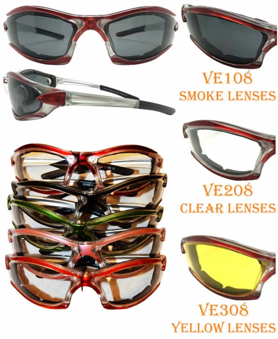 12 pack Sunglasses. 5 Assorted Colors 2 of each Color, Orange, Red, Green, Pink & 4 Black Our eye-wear is made from top quality materials. UV400 Filtering. Foam Padded for additional wind & dust protection. Aerodynamic form stays in place while riding. All of our eye-wear have shatterproof poly-carbonate lenses. Our lenses exceed the requirements set for impact tests. FEATURES