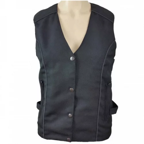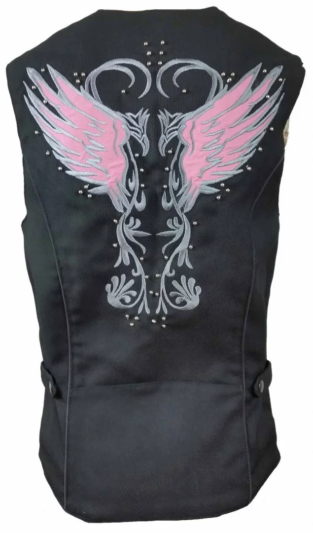 Embroidery available in Black, Pink, and Purple Ladies Textile Vest. A great alternative to leather, this light weight water resistant cloth with embroidery and reflective wing design, is appointed with two front zipper pockets, two inside pockets, and adjustable sides.