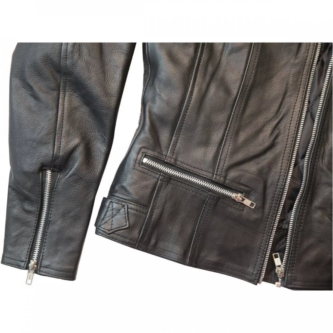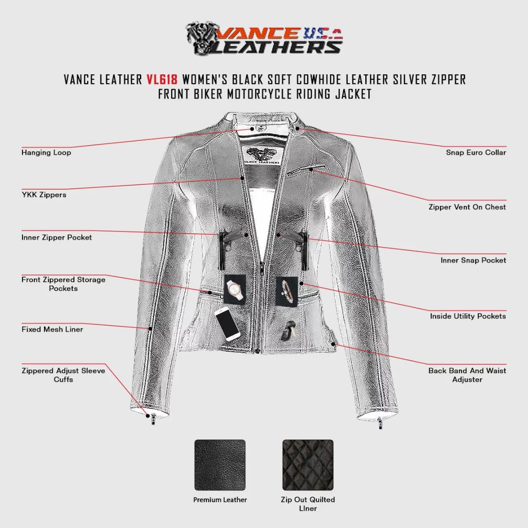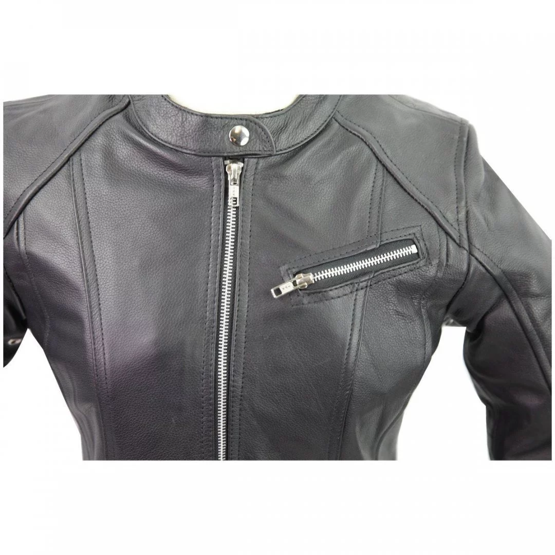 Ladies Biker 7 Pocket Euro Collar OR No Collar Premium Naked Leather Scooter Racer Jacket  Zip Front ~ Back Band & Side Waist Adjusters ~ Euro/No Collar  This FINE lined figure flattering jacket is made from premium grade naked leather which has an already ‘broken in’ feel and known for its durability, minimal flaws and EXCELLENT wear.  In the scooter racer style with a zip front, 3 zip front pockets and 4 inner pockets! Back band and side waist adjusters for COMFORT & CUSTOM fit with a one snap Euro collar OR wear with NO collar.   Z/O  quilted liner making it PERFECT for ALL SEASON RIDING! Features Include: * Made from Top Grain Premium Naked Leather * Single Snap Euro Collar OR No Collar * Heavy Duty YKK Zippers * Zip Front * 3 Zip Outer Pockets & 4 Inner Pockets * Zip Cuffs * Back Band & Waist Adjusters * Vented  Size Chest Waist Sleeve Small 34 1/2″-35 1/2″ 30″-31″ 23 1/4 Medium 36 1/2″-37 1/2″ 32″-33″ 23 1/2 Large 38 1/2″-39 1/2″ 34″35″ 23 3/4 X-Large 40 1/2″-41 1/2″ 36″-37″ 24 2X-Large 42 1/2″-43 1/2″ 38″-39″ 24 1/2 3X-Large 44 1/2″-45 1/2″ 40″-41″ 25 4X-Large 46 1/2″-47 1/2′ 42″-43″ 25 1/2