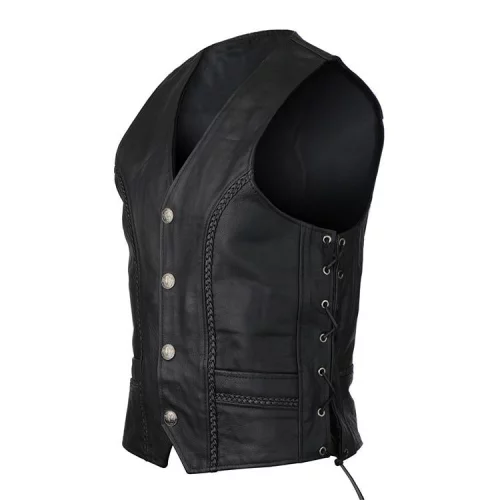 Buffalo Nickel Leather Motorcycle Vest with Braids and Side Laces. This leather vest with buffalo nickel accents is a great way to show off what was part of a drive to beautify the American coin. Added with silver hardware and braided designs, this vest is definitely worth having. Features Mid-weight leather shell Straight bottom Braids on front and back Buffalo Nickel front snap closure Side laces for an adjustable fit Polyester lining 2 front pockets and 2 inside pocket for essentials V- neck with snap closure on the front