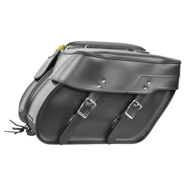 Plain Slanted Motorcycle Saddlebags The Plain Slanted Motorcycle Saddlebags measure 16” L x 11” H x 7” D and are quite roomy. Although these beauties look like they were made out of genuine leather, they were actually crafted from a PVC material that is very durable and requires less care and maintenance than leather. These bags offer you a lot of bang for your buck and include some great features, including two snaps on the lid to help keep it closed and a universal zip-off, throw-over attachment that has a Velcro closure. These sturdy bags also include a hard sheet so that they will keep their shape. On the interior of the bag is a small pocket for stashing those hard-to-find smaller items. These bags also boast quick-release closures hidden underneath the traditional straps and buckle closures.