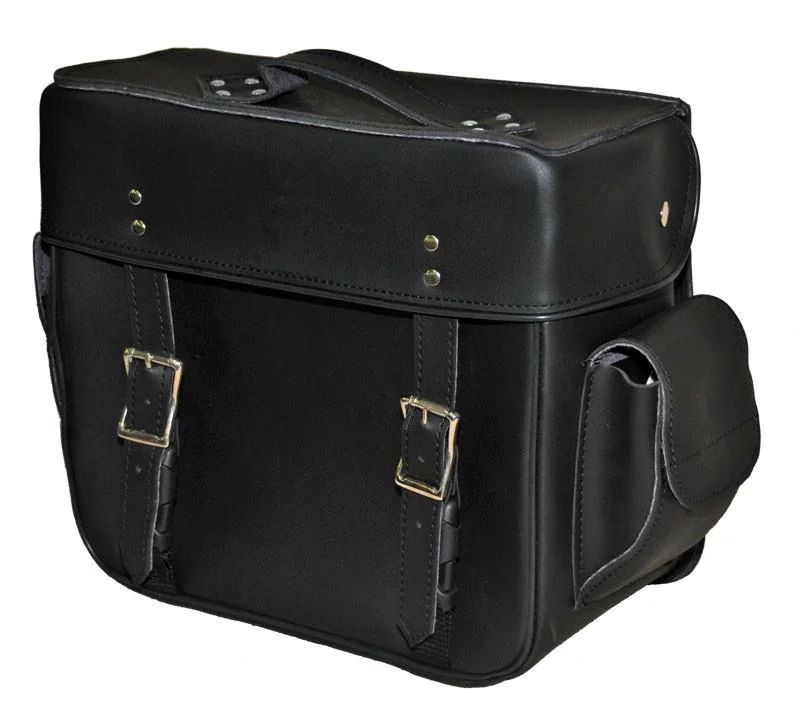Medium 2 Strap Plain Sissy Bar Bag This is a 13″ X 12″ X 7″ bag designed to hold your supplies without a lot of bulk. Available in three trim styles. Γ FEATURES PVC construction 13″ X 12″ X 7″ Three trims – plain, stud, braid Hatbox lid Unbreakable quick release Steel reinforcement on the top rim to prevent buckling Universal adjustable sissybar straps for easy attachment Water resistant Oil resistant FEATURES