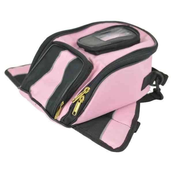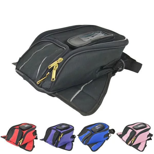 Features Water resistant without cover Waterproof cover with window included Carrying handle and adjustable shoulder strap Magnetic installation with Quick Release straps for keeping tank bag secure on bike Reflective piping for night-time visibility Zippered side pocket Cell phone pocket with translucent window